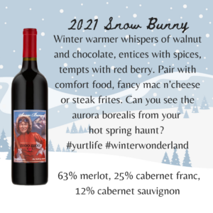 Bottle & Case Special on Zhoo Zhoo Snowbunny. $21/bottle (regularly $24) OR Buy a case for $240 (reg. $288), bottle price $20/bottle.*CLOSED Sat, December 21st for a private event. OPEN, Sun, December 22nd, 12-5:00